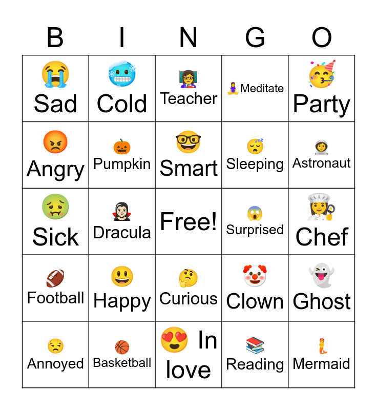 This bingo card has a free space and 25 words: π Happy, π In love, π€ Smart, π Annoyed, π₯³ Party, π Sad, π‘ Angry, π₯Ά Cold, π± Surprised, π€ Curious, π΄ Sleeping, π€’ Sick, π€‘ Clown, π» Ghost, π Pumpkin, π·ββοΈConstruction worker, π©βπ³ Chef, π©βπ« Teacher, π©βπ Astronaut, π§π»ββοΈ Dracula, π§ Mermaid, π Basketball, π Football, π§ββοΈMeditate and πReading.