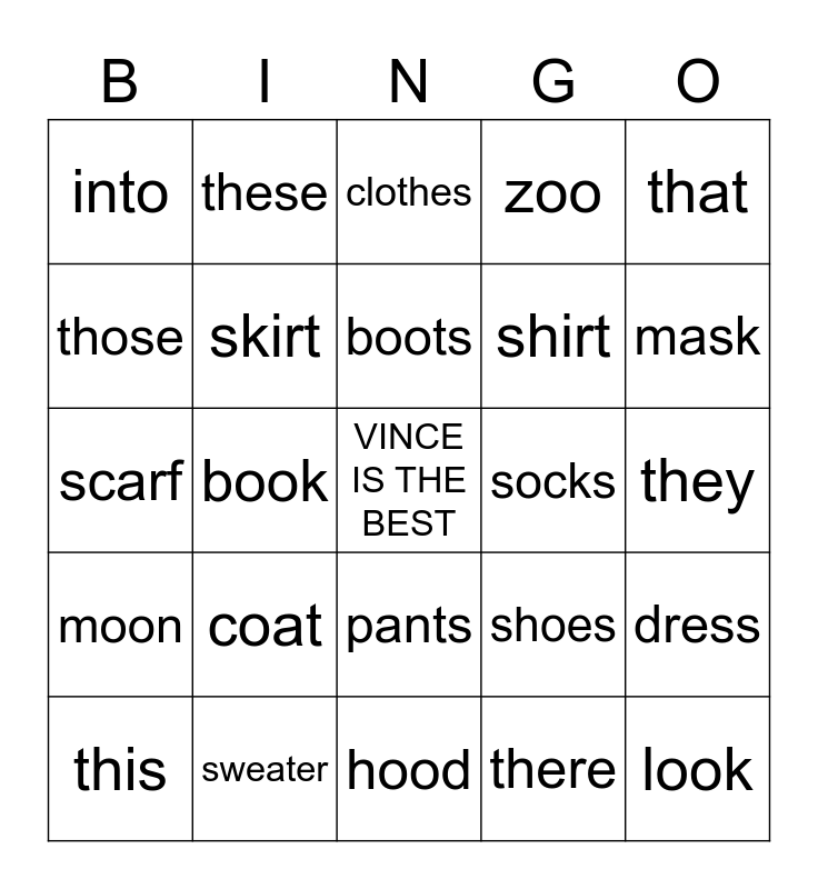 This bingo card has a free space and 24 words: coat, sweater, boots, this, that, into, those, these, socks, pants, shirt, scarf, shoes, dress, skirt, there, they, clothes, mask, book, look, moon, zoo and hood.
