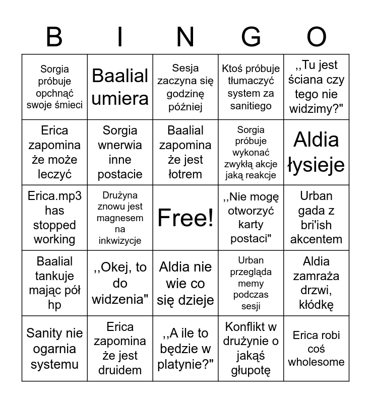 This bingo card has a free space and 24 words: ,,Okej, to do widzenia", Erica zapomina że jest druidem, Baalial zapomina że jest łotrem, Sanity nie ogarnia systemu, ,,Tu jest ściana czy tego nie widzimy?", Sorgia próbuje opchnąć swoje śmieci, Erica zapomina że może leczyć, Baalial umiera, ,,Nie mogę otworzyć karty postaci", Aldia nie wie co się dzieje, Sorgia próbuje wykonać zwykłą akcje jaką reakcje, Erica.mp3 has stopped working, Urban przegląda memy podczas sesji, Aldia zamraża drzwi, kłódkę, Sorgia wnerwia inne postacie, Konflikt w drużynie o jakąś głupotę, Urban gada z bri'ish akcentem, Sesja zaczyna się godzinę później, Aldia łysieje, Drużyna znowu jest magnesem na inkwizycje, Erica robi coś wholesome, Baalial tankuje mając pół hp, Ktoś próbuje tłumaczyć system za sanitiego and ,,A ile to będzie w platynie?".