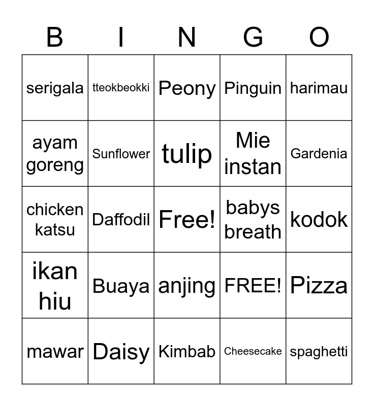 This bingo card has a free space and 25 words: Buaya, Kimbab, tulip, mawar, harimau, serigala, ayam goreng, tteokbeokki, babys breath, anjing, Mie instan, chicken katsu, FREE!, Pizza, Sunflower, gorila, kodok, Peony, Gardenia, Daffodil, spaghetti, Daisy, ikan hiu, Pinguin and Cheesecake.