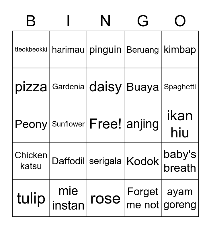 This bingo card has a free space and 25 words: Daffodil, rose, daisy, tulip, kimbap, tteokbeokki, pizza, harimau, anjing, serigala, Buaya, Peony, Kodok, baby's breath, Gardenia, Cheesecake, ikan hiu, pinguin, Spaghetti, Sunflower, ayam goreng, mie instan, Chicken katsu, Beruang and Forget me not.