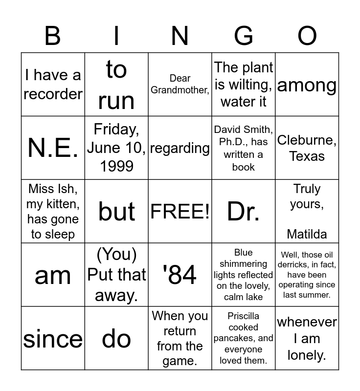 This bingo card has a free space and 24 words: (You) Put that away., do, regarding, since, among, I have a recorder, N.E., to run, Dr., '84, David Smith, Ph.D., has written a book, Miss Ish, my kitten, has gone to sleep, Blue shimmering lights reflected on the lovely, calm lake, Well, those oil derricks, in fact, have been operating since last summer., Friday, June 10, 1999, Priscilla cooked pancakes, and everyone loved them., Truly yours, Matilda, Dear Grandmother,, Cleburne, Texas, but, whenever I am lonely., am, The plant is wilting, water it and When you return from the game..
