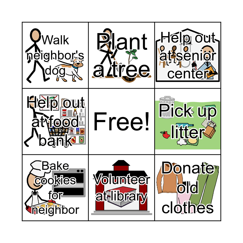 This bingo card has 9 images, a free space and 9 words: Bake cookies for neighbor, Help out at senior center, Plant a tree, Help out at food bank, Walk neighbor's dog, Pick up litter, Donate old clothes, Work at animal shelter and Volunteer at library.