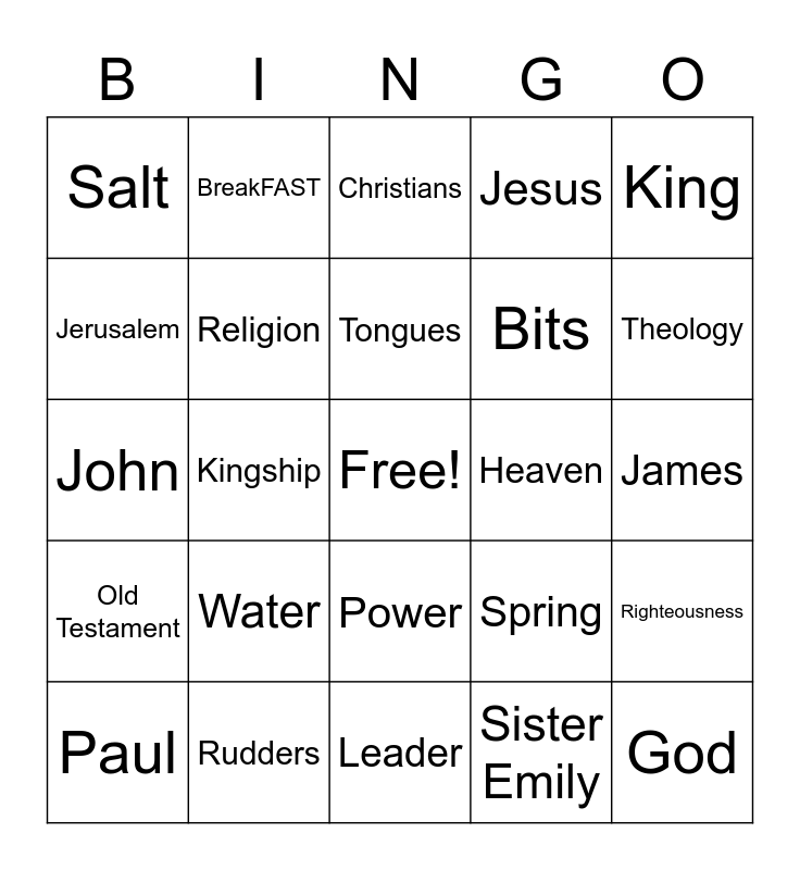 This bingo card has a free space and 28 words: Righteousness, Love, Bits, Sister Emily, Jerusalem, Christians, BreakFAST, Old Testament, Heaven, Paul, John, Jesus, Rudders, Leader, Theology, Luther, Water, Religion, Tongues, Power, Salt, Creation, God, Kingship, James, Spring, King and OctoberFAST.