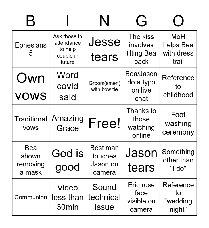 This bingo card has a free space and 24 words: God is good, Video less than 30min, Groom(smen) with bow tie, Communion, MoH helps Bea with dress trail, Ephesians 5, Own vows, Ask those in attendance to help couple in future, Thanks to those watching online, Best man touches Jason on camera, Bea/Jason do a typo on live chat, Traditional vows, Jason tears, Something other than "I do", Word covid said, Eric rose face visible on camera, Foot washing ceremony, Jesse tears, Reference to childhood, Amazing Grace, Reference to "wedding night", Bea shown removing a mask, The kiss involves tilting Bea back and Sound technical issue.