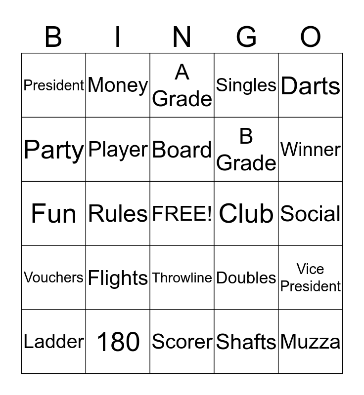 This bingo card has a free space and 24 words: Flights, 180, Board, Ladder, Darts, President, Party, Money, Club, Throwline, B Grade, Fun, Doubles, Vice President, Player, Shafts, Social, A Grade, Winner, Rules, Muzza, Vouchers, Singles and Scorer.