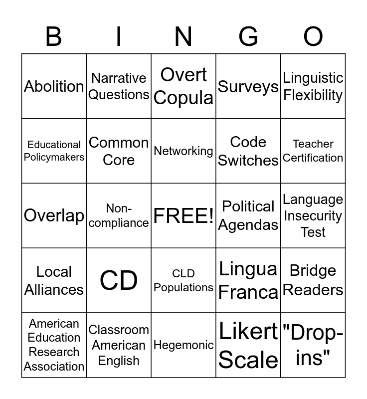 This bingo card has a free space and 24 words: CD, Classroom American English, Networking, American Education Research Association, Linguistic Flexibility, Abolition, Educational Policymakers, Narrative Questions, Political Agendas, CLD Populations, Code Switches, Overlap, Lingua Franca, Bridge Readers, Common Core, Likert Scale, Language Insecurity Test, Overt Copula, Teacher Certification, Non- compliance, "Drop-ins", Local Alliances, Surveys and Hegemonic.