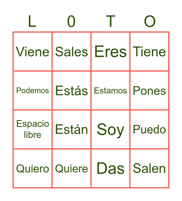 This bingo card has 20 words: Puedo, Vienes, Eres, Es, Quiero, Podemos, Quiere, Viene, Espacio libre, Sales, Están, Soy, Estás, Salen, Estamos, Dan, Pones, Tiene, Das and Voy.