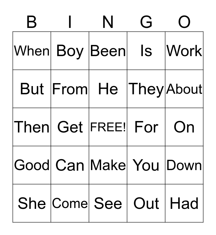 This bingo card has a free space and 24 words: Can, Come, He, She, Work, When, But, Boy, For, Make, They, Then, You, Down, From, Out, On, Been, About, Get, Had, Good, Is and See.