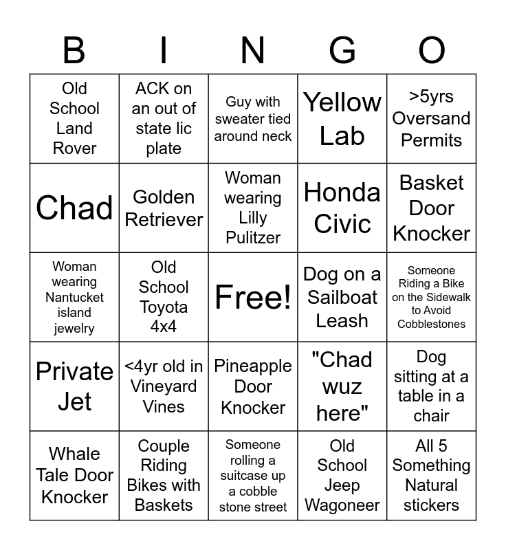 This bingo card has a free space and 46 words: BOX sticker, All 5 Something Natural stickers, Something Natural Jeep Tire Cover, Someone rolling a suitcase up a cobble stone street, <4yr old in Vineyard Vines, A couple on a pair of Scooters, ACK on an out of state lic plate, Becky, Chad, Cicso Brewery Logo clothing, Golden Retriever, Yellow Lab, Dog sitting at a table in a chair, "Chad wuz here", Whale Pants, Lobster Pants, Woman wearing Lilly Pulitzer, Dog on a Sailboat Leash, Dog on a Lighthouse Leash, >5yrs Oversand Permits, Old School Toyota 4x4, Old School Jeep Wagoneer, Old School Land Rover, Honda Civic, House with "ACK" in the name, Basket Door Knocker, Whale Tale Door Knocker, Scallop Door Knocker, Pineapple Door Knocker, Private Jet, Woman with pearls, Women in Matching Outfits, Nantucket Reds Couple, Nantucket Reds Pants, Nantucket Reds Shorts, Couple Riding Bikes with Baskets, Someone Riding a Bike on the Sidewalk to Avoid Cobblestones, A seal in the water, Photo Op at Lighthouse, Guy in pegged pants, Someone wearing "Sandbar" merch, Guy with sweater tied around neck, Woman wearing Nantucket island jewelry, Clapboard House NOT painted white, People on a widow's walk and A Salt Box house.