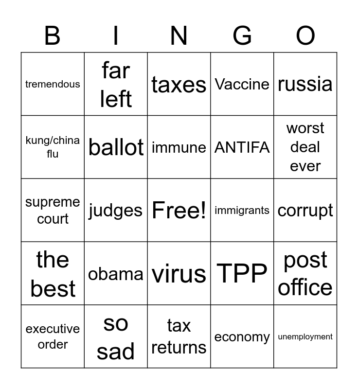 This bingo card has a free space and 37 words: smart, huge, greatest, ballot, post office, obama, immune, hoax, russia, iran, judges, Vaccine, unemployment, corrupt, kung/china flu, the best, china, taxes, virus, immigrants, tremendous, worst deal ever, executive order, tax returns, crooked hillary, economy, far left, liberal’s, keep america great, fake news, wrong, so sad, supreme court, obama care, TPP, ANTIFA and election results.