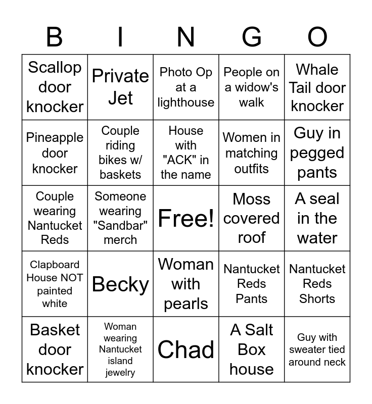 This bingo card has a free space and 25 words: Becky, Chad, House with "ACK" in the name, Basket door knocker, Whale Tail door knocker, Scallop door knocker, Pineapple door knocker, Private Jet, Moss covered roof, Woman with pearls, Women in matching outfits, Couple wearing Nantucket Reds, Nantucket Reds Pants, Nantucket Reds Shorts, Couple riding bikes w/ baskets, Someone riding a bike on the sidewalk to avoid cobblestones, A seal in the water, Photo Op at a lighthouse, Guy in pegged pants, Someone wearing "Sandbar" merch, Guy with sweater tied around neck, Woman wearing Nantucket island jewelry, Clapboard House NOT painted white, People on a widow's walk and A Salt Box house.