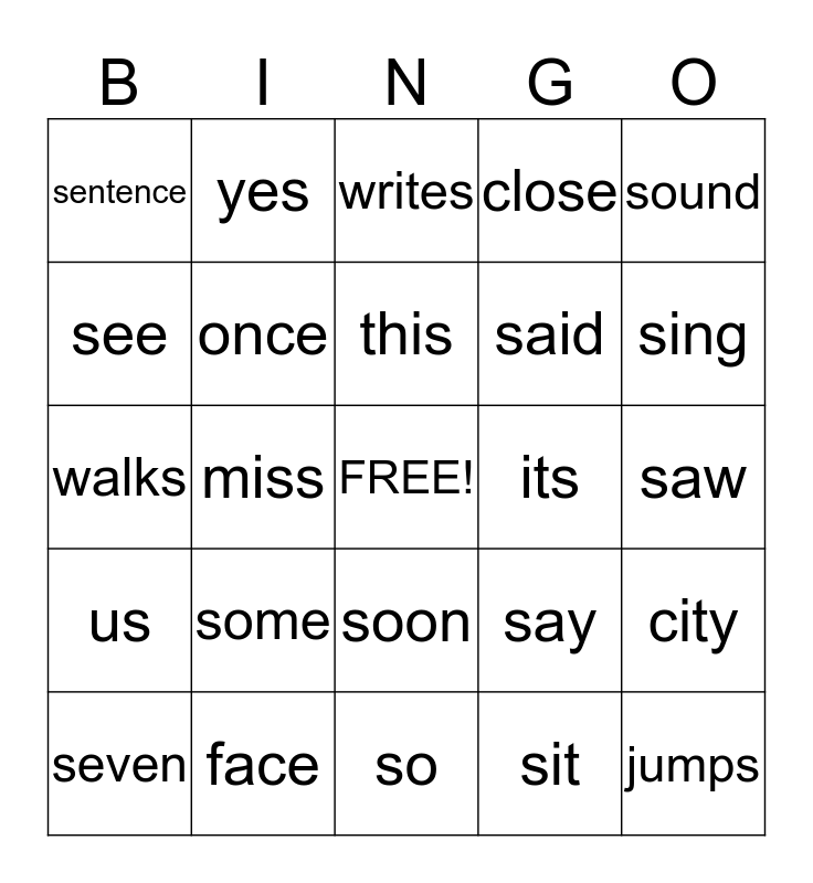 This bingo card has a free space and 24 words: some, face, this, seven, sound, sentence, see, yes, its, soon, said, walks, say, city, once, sit, saw, writes, sing, miss, jumps, us, close and so.
