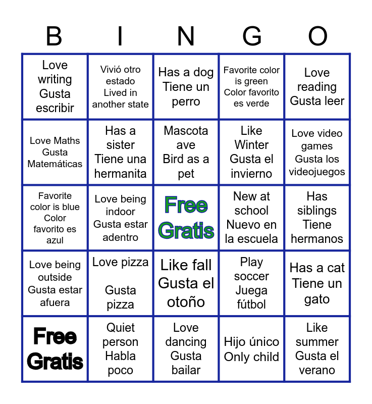 This bingo card has a free space and 24 words: Free Gratis, Love pizza Gusta pizza, Mascota ave Bird as a pet, Hijo único Only child, Love reading Gusta leer, Love writing Gusta escribir, Vivió otro estado Lived in another state, Has a dog Tiene un perro, New at school Nuevo en la escuela, Has siblings Tiene hermanos, Favorite color is blue Color favorito es azul, Has a sister Tiene una hermanita, Play soccer Juega fútbol, Has a cat Tiene un gato, Love Maths Gusta Matemáticas, Quiet person Habla poco, Love dancing Gusta bailar, Favorite color is green Color favorito es verde, Love video games Gusta los videojuegos, Love being outside Gusta estar afuera, Love being indoor Gusta estar adentro, Like fall Gusta el otoño, Like Winter Gusta el invierno and Like summer Gusta el verano.