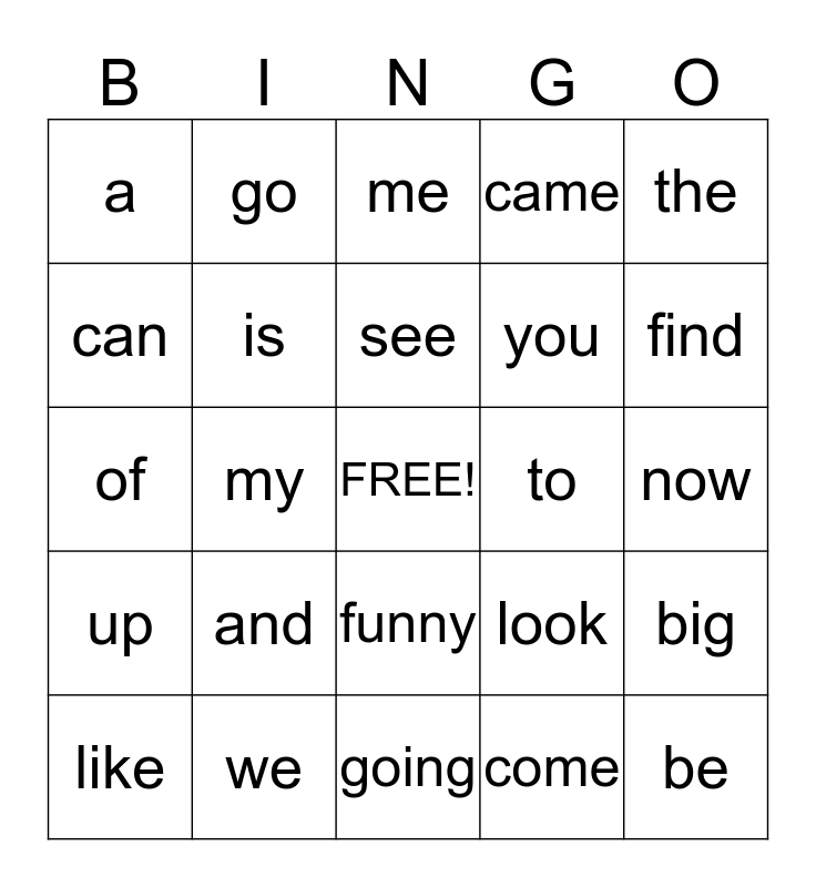 This bingo card has a free space and 24 words: and, we, see, like, the, a, can, go, to, funny, you, of, look, big, is, come, now, me, find, my, be, up, came and going.