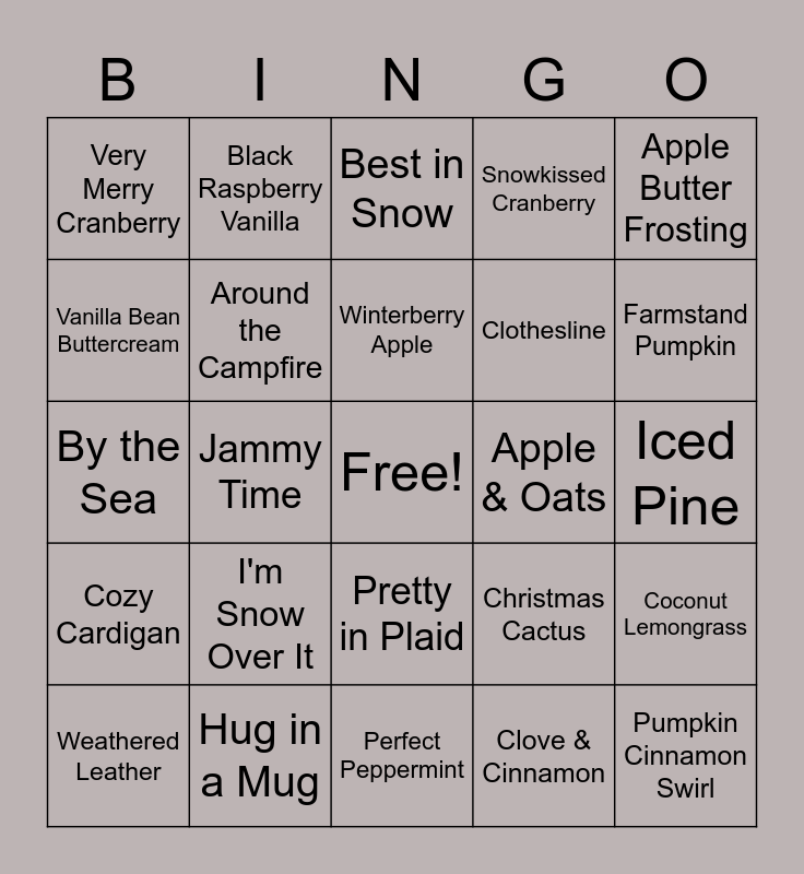 This bingo card has a free space and 24 words: I'm Snow Over It, Hug in a Mug, Winterberry Apple, Weathered Leather, Apple Butter Frosting, Very Merry Cranberry, Vanilla Bean Buttercream, Black Raspberry Vanilla, Apple & Oats, Pretty in Plaid, Clothesline, By the Sea, Christmas Cactus, Coconut Lemongrass, Around the Campfire, Clove & Cinnamon, Iced Pine, Best in Snow, Farmstand Pumpkin, Jammy Time, Pumpkin Cinnamon Swirl, Cozy Cardigan, Snowkissed Cranberry and Perfect Peppermint.