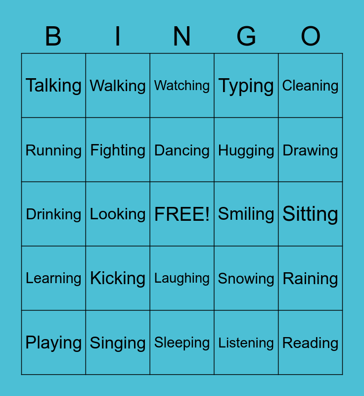 This bingo card has a free space and 24 words: Kicking, Singing, Dancing, Playing, Cleaning, Talking, Running, Walking, Smiling, Laughing, Hugging, Drinking, Snowing, Raining, Fighting, Listening, Sitting, Watching, Drawing, Looking, Reading, Learning, Typing and Sleeping.