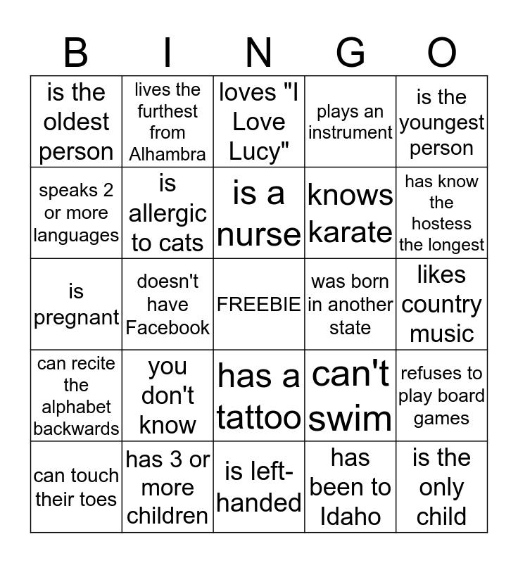 This bingo card has a free space and 24 words: you don't know, has 3 or more children, is a nurse, can touch their toes, is the youngest person, is the oldest person, speaks 2 or more languages, lives the furthest from Alhambra, was born in another state, has a tattoo, knows karate, is pregnant, can't swim, refuses to play board games, is allergic to cats, has been to Idaho, likes country music, loves "I Love Lucy", has know the hostess the longest, doesn't have Facebook, is the only child, can recite the alphabet backwards, plays an instrument and is left-handed.
