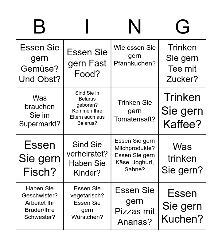 This bingo card has 16 words: Essen Sie vegetarisch? Essen Sie gern Würstchen?, Was trinken Sie gern?, Wie essen Sie gern Pfannkuchen?, Essen Sie gern Gemüse? Und Obst?, Essen Sie gern Fisch?, Essen Sie gern Fast Food?, Essen Sie gern Milchprodukte? Essen Sie gern Käse, Joghurt, Sahne?, Essen Sie gern Pizzas mit Ananas?, Was brauchen Sie im Supermarkt?, Sind Sie in Belarus geboren? Kommen Ihre Eltern auch aus Belarus?, Haben Sie Geschwister? Arbeitet Ihr Bruder/Ihre Schwester?, Trinken Sie gern Tee mit Zucker?, Sind Sie verheiratet? Haben Sie Kinder?, Trinken Sie gern Kaffee?, Trinken Sie gern Tomatensaft? and Essen Sie gern Kuchen?.