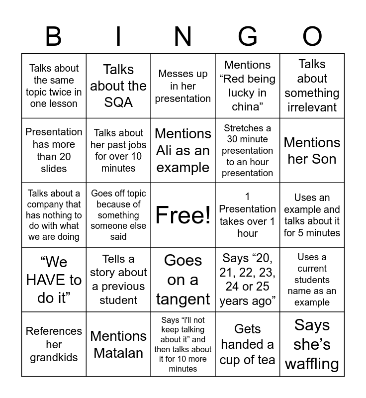 This bingo card has a free space and 29 words: References her grandkids, References her past in the "industry", Goes off topic because of something someone else said, Gets distracted by her story, Talks about the same topic twice in one lesson, Messes up in her presentation, Talks about her past jobs for over 10 minutes, Tells a story about a previous student, 1 Presentation takes over 1 hour, Mentions Matalan, Uses an example and talks about it for 5 minutes, Says she’s waffling, Says “i'll not keep talking about it” and then talks about it for 10 more minutes, Gets handed a cup of tea, Mentions her Son, Goes over something we did last year, Goes on a tangent, “We HAVE to do it”, Talks about something irrelevant, Talks about a company that has nothing to do with what we are doing, Says “20, 21, 22, 23, 24 or 25 years ago”, Purposely mispronounces something, Stretches a 30 minute presentation to an hour presentation, Presentation has more than 20 slides, Mentions “Red being lucky in china”, Talks about the SQA, Uses a current students name as an example, Mentions Ali as an example and Mentions Chris Cannon.