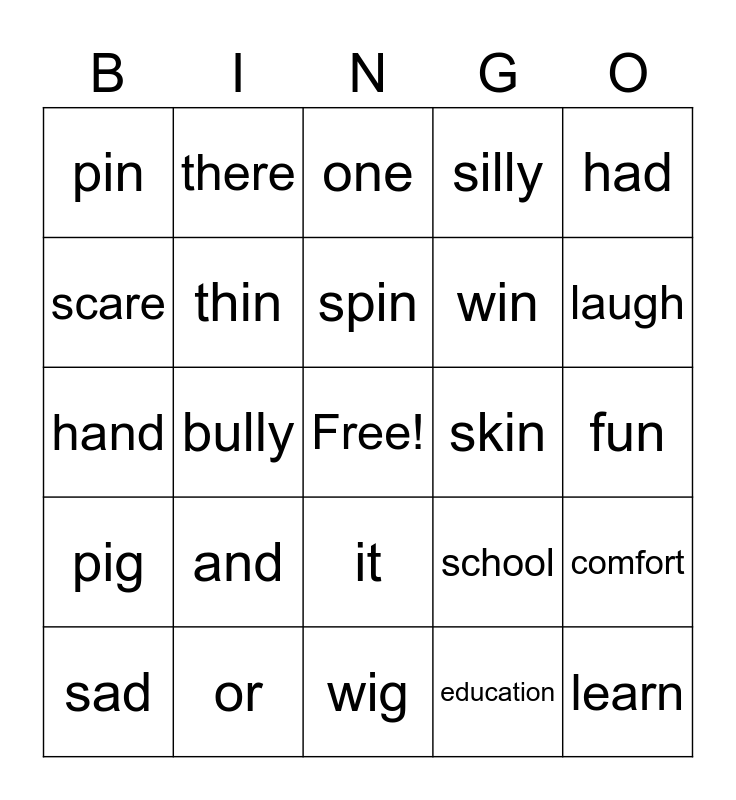 This bingo card has a free space and 29 words: from, or, one, that, had, pin, thin, spin, skin, comfort, sad, bully, education, learn, hand, begin, wig, school, laugh, pig, and, run, win, fun, scare, there, it, silly and at.