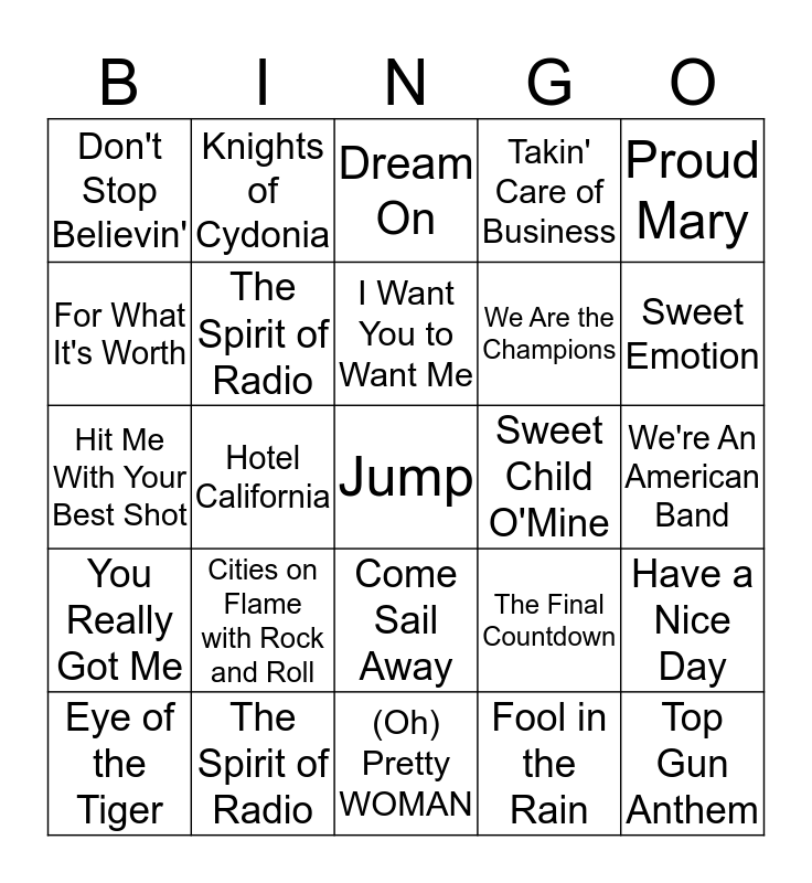 This bingo card has a free space and 24 words: Cities on Flame with Rock and Roll, The Spirit of Radio, I Want You to Want Me, Eye of the Tiger, Proud Mary, Don't Stop Believin', For What It's Worth, Knights of Cydonia, Sweet Child O'Mine, Come Sail Away, We Are the Champions, Hit Me With Your Best Shot, The Final Countdown, Have a Nice Day, The Spirit of Radio, Fool in the Rain, We're An American Band, Dream On, Sweet Emotion, Hotel California, Top Gun Anthem, You Really Got Me, Takin' Care of Business and (Oh) Pretty WOMAN.