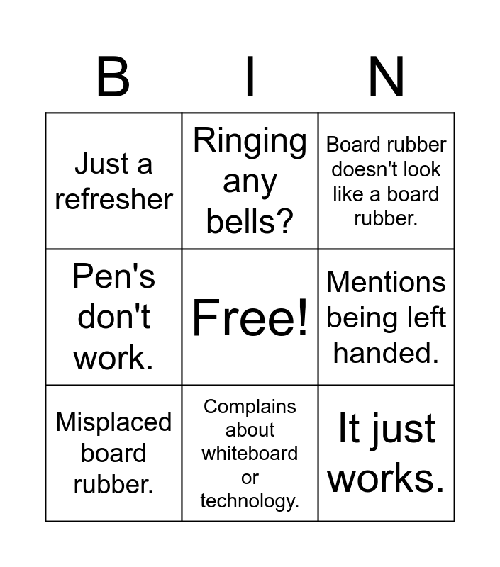 This bingo card has a free space and 8 words: Mentions being left handed., Board rubber doesn't look like a board rubber., Ringing any bells?, Misplaced board rubber., Just a refresher, It just works., Pen's don't work. and Complains about whiteboard or technology..