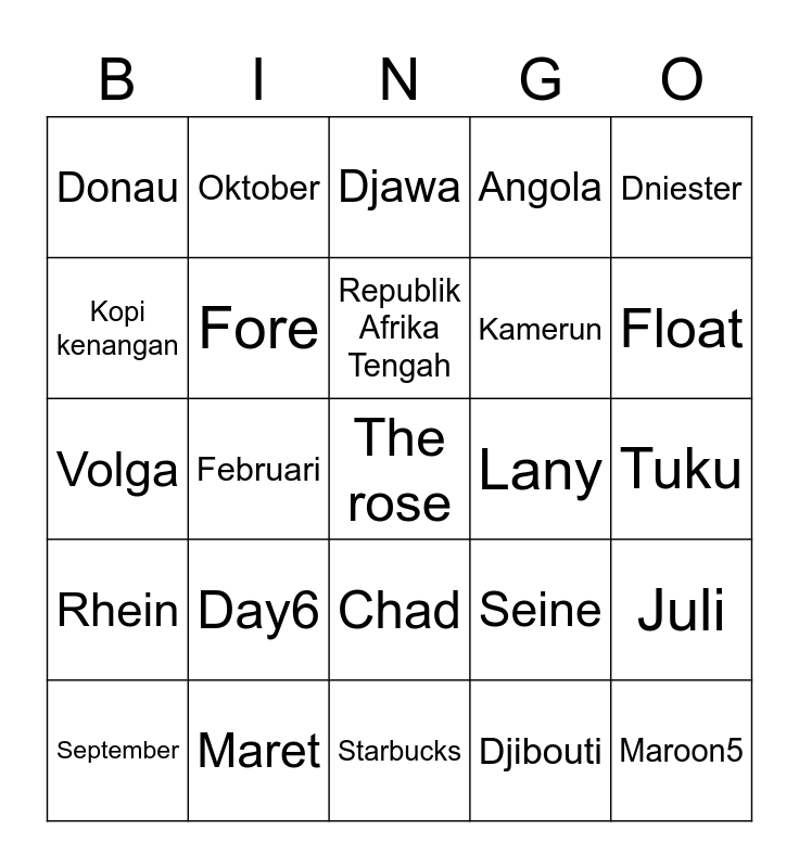 This bingo card has a free space and 24 words: Day6, Maret, Republik Afrika Tengah, September, Dniester, Donau, Kopi kenangan, Oktober, Lany, Chad, Kamerun, Volga, Seine, Juli, Fore, Djibouti, Tuku, Djawa, Float, Februari, Maroon5, Rhein, Angola and Starbucks.