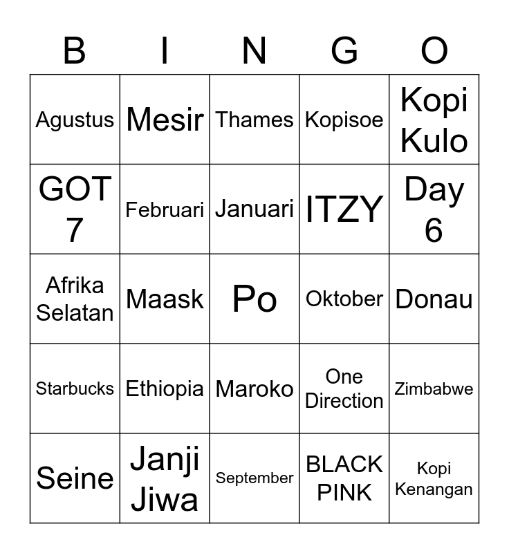 This bingo card has 25 words: Ethiopia, September, Januari, Seine, Kopi Kulo, Agustus, GOT 7, Mesir, Oktober, Maroko, ITZY, Afrika Selatan, One Direction, Zimbabwe, Februari, Kopi Kenangan, Donau, Thames, Day 6, Maask, Po, Janji Jiwa, Starbucks, Kopisoe and BLACK PINK.