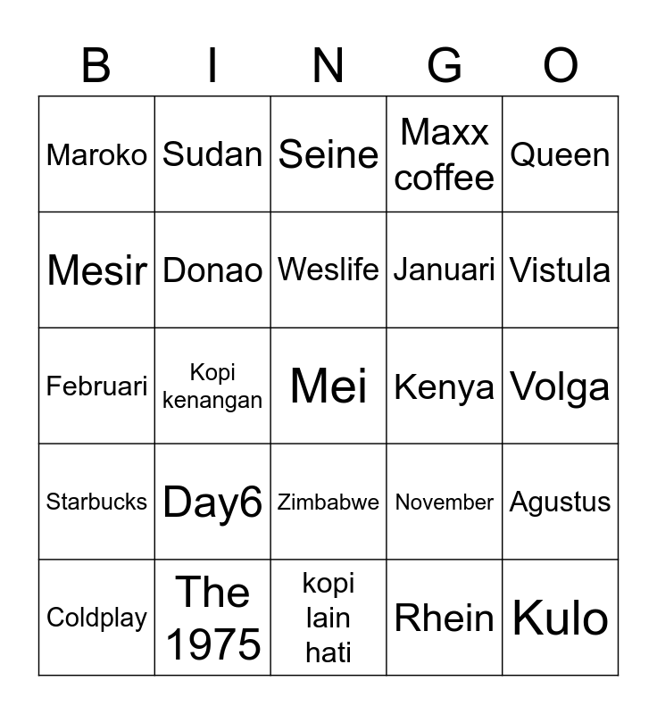 This bingo card has a free space and 24 words: Day6, The 1975, Weslife, Coldplay, Queen, Maroko, Mesir, Sudan, Kenya, Zimbabwe, Januari, Februari, November, Agustus, Donao, Rhein, Volga, Seine, Vistula, Kopi kenangan, Kulo, Starbucks, Maxx coffee and kopi lain hati.