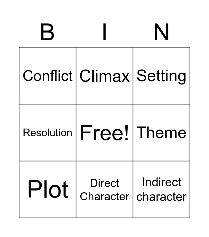 This bingo card has a free space and 8 words: Theme, Setting, Climax, Plot, Conflict, Indirect character, Resolution and Direct Character.