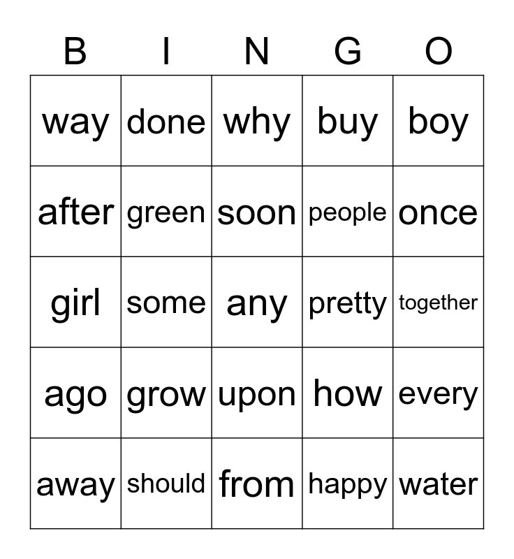 This bingo card has a free space and 29 words: away, now, some, today, way, why, green, grow, pretty, should, together, water, from, happy, once, so, upon, ago, boy, girl, how, old, people, after, buy, done, every, soon and work.