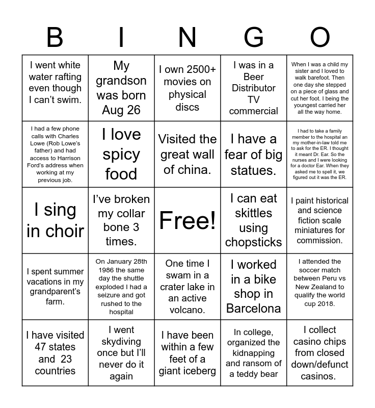 This bingo card has a free space and 32 words: In college, organized the kidnapping and ransom of a teddy bear, Coach soccer, I’ve broken my collar bone 3 times., I can play Bano (marbles) and I like traditional fishing, I spent summer vacations in my grandparent’s farm., I love spicy food, When I was a child my sister and I loved to walk barefoot. Then one day she stepped on a piece of glass and cut her foot. I being the youngest carried her all the way home., I attended the soccer match between Peru vs New Zealand to qualify the world cup 2018., My grandson was born Aug 26, I lived 2 years in Australia, Visited the great wall of china., I own 2500+ movies on physical discs, I love to move furniture around the houses several times a year, I worked as a copy editor for a publishing company, I can eat skittles using chopsticks, As a child, I used to play with squirrel tails, I have visited 47 states and 23 countries, I sing in choir, One time I swam in a crater lake in an active volcano., On January 28th 1986 the same day the shuttle exploded I had a seizure and got rushed to the hospital, I worked in a bike shop in Barcelona, I once dunked on a 10 foot rim, I paint historical and science fiction scale miniatures for commission., I went skydiving once but I’ll never do it again, I collect casino chips from closed down/defunct casinos., I was in a Beer Distributor TV commercial, I have a fear of big statues., I had a few phone calls with Charles Lowe (Rob Lowe’s father) and had access to Harrison Ford’s address when working at my previous job., I went white water rafting even though I can’t swim., I have been within a few feet of a giant iceberg, Guatemala was the first country outside of the U.S that I travelled to and I had to take a family member to the hospital an my mother-in-law told me to ask for the ER. I thought it meant Dr. Ear. So the nurses and I were looking for a doctor Ear. When they asked me to spell it, we figured out it was the ER..