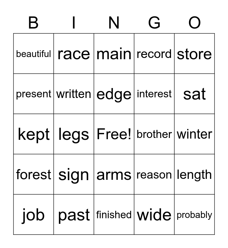 This bingo card has a free space and 24 words: sign, past, edge, job, store, beautiful, present, race, brother, arms, interest, kept, reason, length, written, wide, winter, main, sat, legs, probably, forest, record and finished.