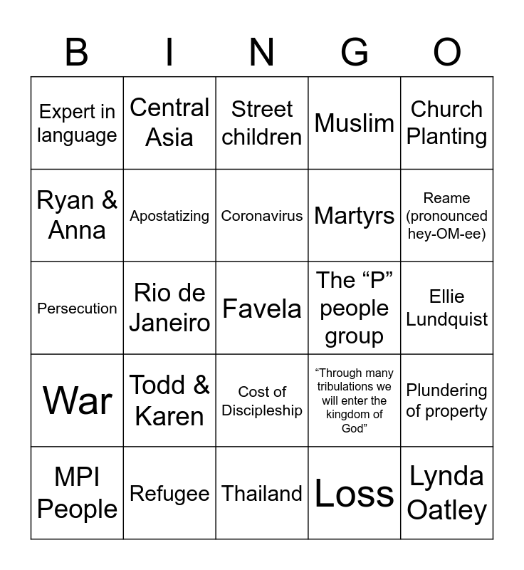 This bingo card has 25 words: Todd & Karen, Thailand, Coronavirus, MPI People, Church Planting, Expert in language, Ryan & Anna, Central Asia, The “P” people group, Cost of Discipleship, Martyrs, Persecution, “Through many tribulations we will enter the kingdom of God”, Plundering of property, Apostatizing, Lynda Oatley, Ellie Lundquist, Street children, Reame (pronounced hey-OM-ee), Rio de Janeiro, Favela, Refugee, War, Muslim and Loss.