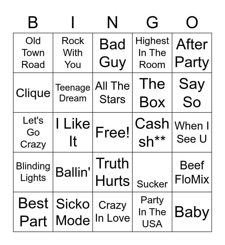This bingo card has a free space and 69 words: Cona Calma, When I See U, For The Night, Sunflower, Sicko Mode, In My Feelings, Highest In The Room, Don’t Start Now, After Party, Senorita, Beef FloMix, Better Now, Old Town Road, Bad Guy, Savage, I Like It, Truth Hurts, The Box, Do It, Blinding Lights, Cash sh**, Sucker, Say So, Thank u, Next, watermelon sugar, Loyalty, Dreams, Bodack Yellow, Party In The USA, BOP, Rock With You, Suge, This Is How We Do It, Poison, Me, Myself, and I, Landslide, Ain't It Fun, Umbrella, Clique, The Worst, Ballin', Baby, September, Look At Her Now, Hot In Herre, Best Part, My Type, Icy, The Scoots, Teenage Dream, All The Stars, California Gurls, Hit Different, Crazy In Love, Juice, Back & Forth, Still Into You, Purple Rain, Gangsta, Let's Go Crazy, Bad, Love On The Brain, Tik Tok, Call Me Maybe, Mood Swings, Nice For What, For The Night, Radioactive and Too Blessed.