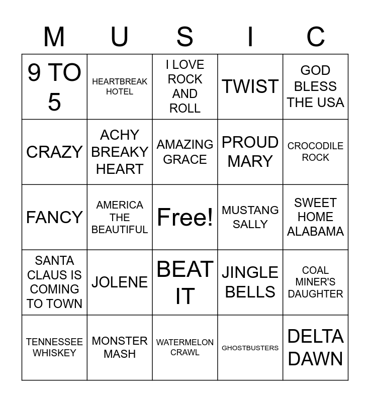 This bingo card has a free space and 24 words: JOLENE, MONSTER MASH, AMAZING GRACE, TENNESSEE WHISKEY, GOD BLESS THE USA, 9 TO 5, CRAZY, HEARTBREAK HOTEL, MUSTANG SALLY, BEAT IT, PROUD MARY, FANCY, JINGLE BELLS, COAL MINER'S DAUGHTER, ACHY BREAKY HEART, GHOSTBUSTERS, SWEET HOME ALABAMA, I LOVE ROCK AND ROLL, CROCODILE ROCK, AMERICA THE BEAUTIFUL, DELTA DAWN, SANTA CLAUS IS COMING TO TOWN, TWIST and WATERMELON CRAWL.