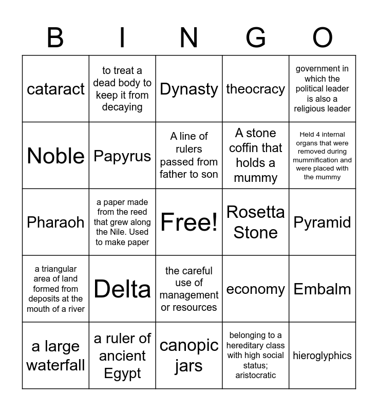 This bingo card has a free space and 24 words: Delta, a ruler of ancient Egypt, A line of rulers passed from father to son, a large waterfall, government in which the political leader is also a religious leader, cataract, Noble, to treat a dead body to keep it from decaying, Rosetta Stone, the careful use of management or resources, A stone coffin that holds a mummy, Pharaoh, economy, Embalm, Papyrus, belonging to a hereditary class with high social status; aristocratic, Pyramid, Dynasty, Held 4 internal organs that were removed during mummification and were placed with the mummy, a paper made from the reed that grew along the Nile. Used to make paper, hieroglyphics, a triangular area of land formed from deposits at the mouth of a river, theocracy and canopic jars.