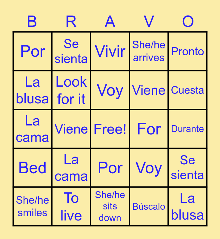 This bingo card has a free space and 42 words: Se levanta, Voy, Se enoja, La cama, Búscalo, Se sienta, La blusa, Sonríe, Vivir, Por, Durante, Cuesta, Viene, Pronto, Se levanta, Voy, Se enoja, La cama, Búscalo, Se sienta, La blusa, Sonríe, Vivir, Por, Durante, Cuesta, Viene, Pronto, Stands up/gets up, I'm coming/going, She/he gets mad, Bed, Look for it, She/he sits down, Blouse, She/he smiles, To live, For, During, Costs, She/he arrives and Soon.