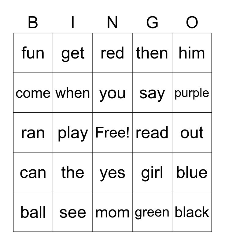 This bingo card has a free space and 24 words: the, see, you, ball, him, fun, come, get, read, yes, say, ran, girl, blue, when, green, out, red, purple, play, black, can, then and mom.
