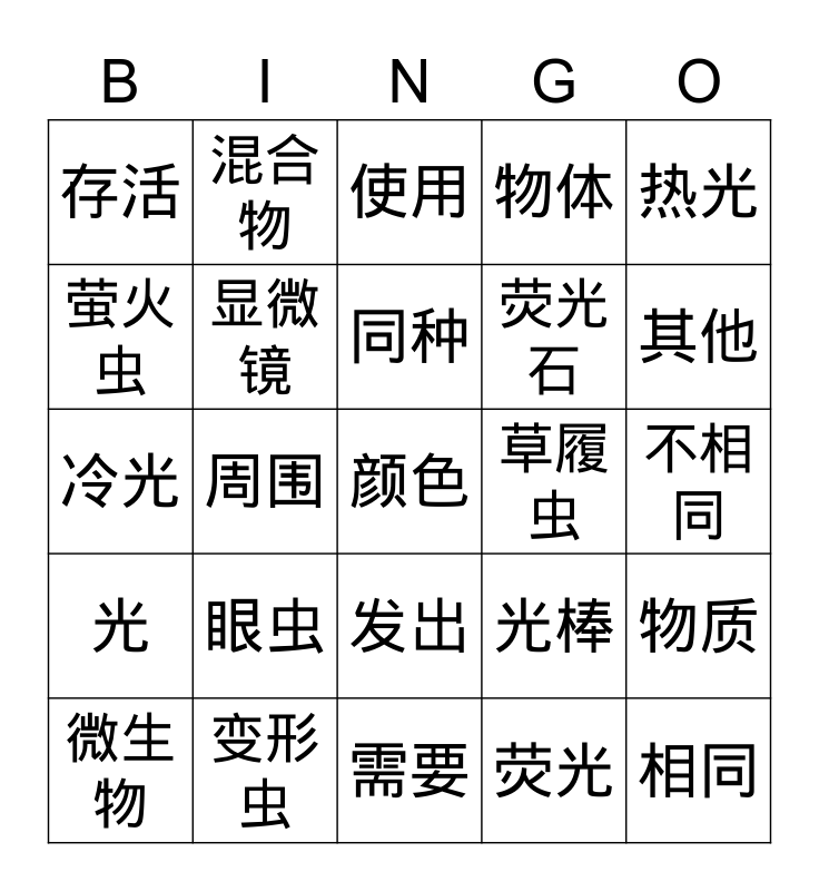 This bingo card has a free space and 29 words: 微生物, 形状, 周围, 到处, 存活, 使用, 显微镜, 眼虫, 草履虫, 变形虫, 不相同, 相同, 需要, 荧光, 其他, 照, 发出, 光, 热光, 冷光, 光棒, 水母, 荧光石, 萤火虫, 物体, 混合物, 物质, 同种 and 不同种.