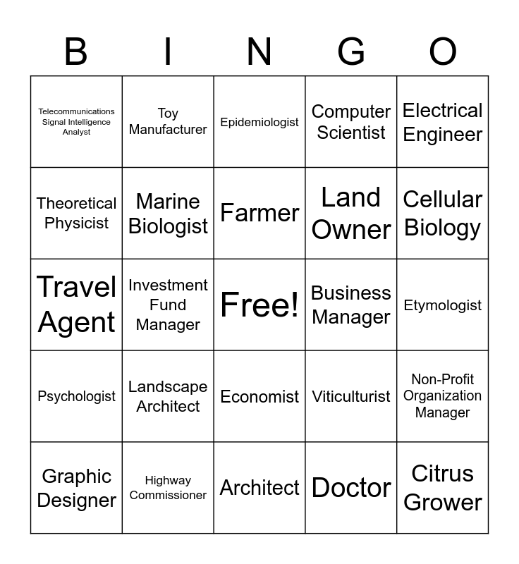 This bingo card has a free space and 24 words: Landscape Architect, Highway Commissioner, Farmer, Graphic Designer, Electrical Engineer, Telecommunications Signal Intelligence Analyst, Theoretical Physicist, Toy Manufacturer, Business Manager, Economist, Land Owner, Travel Agent, Viticulturist, Non-Profit Organization Manager, Marine Biologist, Doctor, Etymologist, Epidemiologist, Cellular Biology, Investment Fund Manager, Citrus Grower, Psychologist, Computer Scientist and Architect.