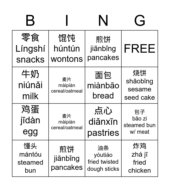 This bingo card has 18 words: 麦片 màipiàn cereal/oatmeal, 炸鸡 zhá jī fried chicken, 煎饼 jiānbǐng pancakes, 零食 Língshí snacks, 点心 diǎnxīn pastries, FREE, 馒头 mántóu steamed bun, 馄饨húntún wontons, 烧饼shāobǐng sesame seed cake, 鸡蛋 jīdàn egg, 油条 yóutiáo fried twisted dough sticks, 牛奶 niúnǎi milk, 包子 bāo zi steamed bun w/ meat, 麦片 màipiàn cereal/oatmeal, 面包 miànbāo bread, 豆浆 dòujiāng soybean milk, 煎饼 jiānbǐng pancakes and 炸鸡 zhá jī fried chicken.