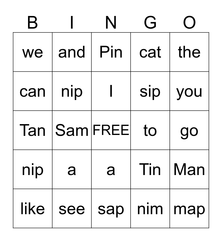 This bingo card has a free space and 24 words: a, see, I, like, the, we, can, and, to, a, sip, Tan, Tin, Man, nip, nim, go, Pin, you, Sam, map, nip, cat and sap.