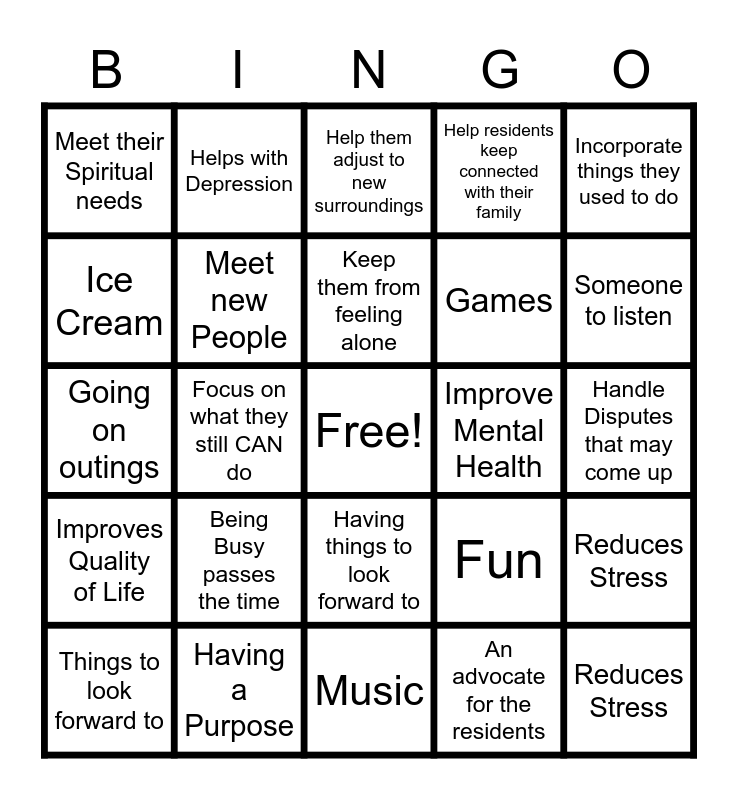 This bingo card has a free space and 27 words: Fun, Laughter, Games, Music, Ice Cream, Help them adjust to new surroundings, Helps with Depression, Improves Quality of Life, Improve Mental Health, Reduces Stress, Going on outings, Help residents keep connected with their family, Things to look forward to, Having a Purpose, Someone to listen, Make new Friends, Meet new People, Keep them from feeling alone, Being Busy passes the time, Meet their Spiritual needs, Handle Disputes that may come up, An advocate for the residents, Focus on what they still CAN do, Reduces Stress, Having things to look forward to, Incorporate things they used to do and Never too old to learn new things.