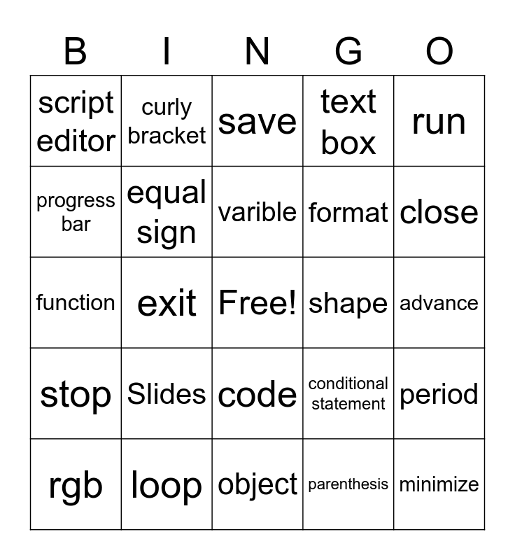 This bingo card has a free space and 24 words: Slides, loop, varible, rgb, run, script editor, progress bar, curly bracket, shape, code, format, function, conditional statement, period, equal sign, parenthesis, advance, save, close, exit, minimize, stop, text box and object.