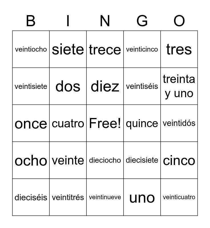 This bingo card has a free space and 32 words: uno, cero, cuatro, seis, ocho, dos, tres, cinco, siete, nueve, diez, trece, doce, catorce, quince, diecinueve, dieciséis, once, dieciocho, veinte, diecisiete, veintiuno, veintidós, veintitrés, veinticuatro, veinticinco, veintiséis, veintisiete, veintiocho, veintinueve, treinta and treinta y uno.