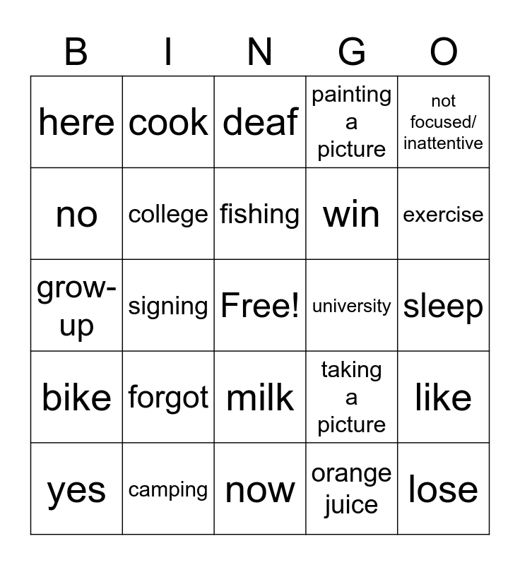 This bingo card has a free space and 84 words: teacher, student, deaf, hearing, teaching, learning, english, spanish, french, ASL, languages, high school, college, university, class/group, here, yes, no, heads, tails, start, win, lose, tie/equal, signing, speaking, remember, remember most, little, some, forgot, hard, easy, grow-up, year, both, now, today, exercise, bike, run, dance, walk, dance, bowl, dog, cook, talk on the phone, knit, sew, watching TV, taking a picture, painting a picture, buy, watch a movie, travel, camping, fishing, typing, sleep, watching the time, listening to music, drink coffee, soda, candy, apple, tying your shoes, focused, not focused/ inattentive, disgust, like, favorite, tea, water, milk, orange juice, hot chocolate, tired, sick, plus/add, minus/ subtract, how many?, to have and zero.