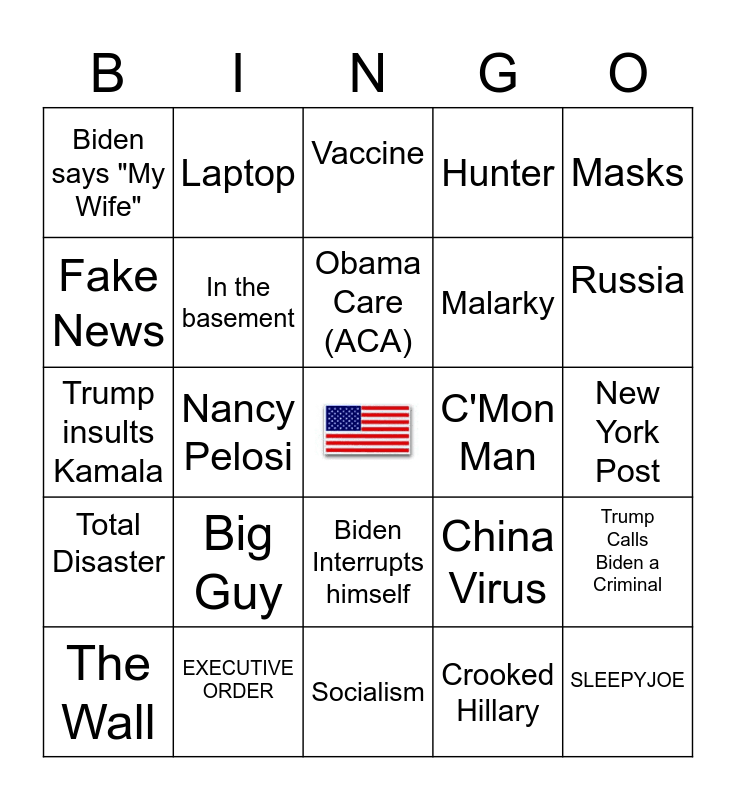 This bingo card has a free space and 24 words: Big Guy, EXECUTIVE ORDER, Obama Care (ACA), The Wall, Masks, Biden says "My Wife", Fake News, Laptop, C'Mon Man, Biden Interrupts himself, Malarky, Trump insults Kamala, China Virus, Trump Calls Biden a Criminal, In the basement, Crooked Hillary, New York Post, Vaccine, Russia, Nancy Pelosi, SLEEPYJOE, Total Disaster, Hunter and Socialism.