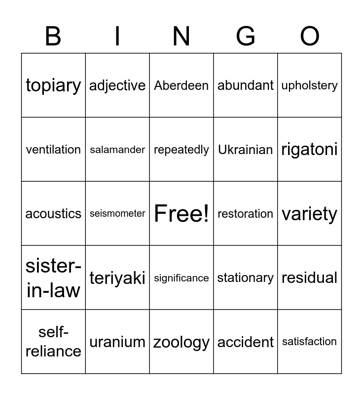 This bingo card has a free space and 46 words: Africa, satisfaction, reciprocal, zoology, teriyaki, uncivilized, adjective, riboflavin, ventilation, superior, salamander, abundant, residual, stationary, albacore, triceratops, repeatedly, restoration, subdivision, upholstery, seismometer, accident, topiary, Ukrainian, reservation, rigatoni, self-reliance, sequentially, significance, sister-in-law, society, spontaneous, theatrical, trepidation, unscrupulous, uranium, variety, Venezuela, veracity, vicinity, vulnerable, Aberdeen, acoustics, according, advantage and aerospace.